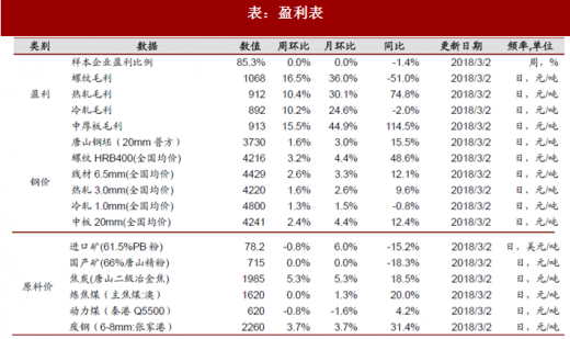 跟踪的钢厂毛利持续上升,螺纹吨毛利1068元/吨,热轧吨毛利912元/吨。