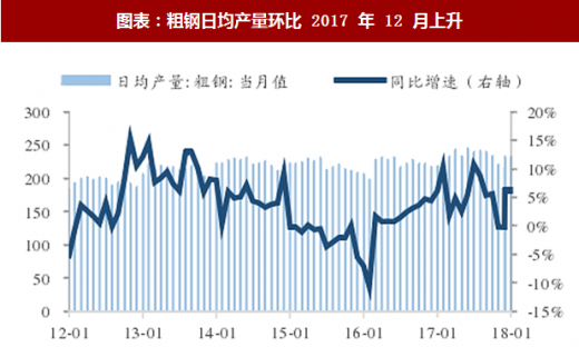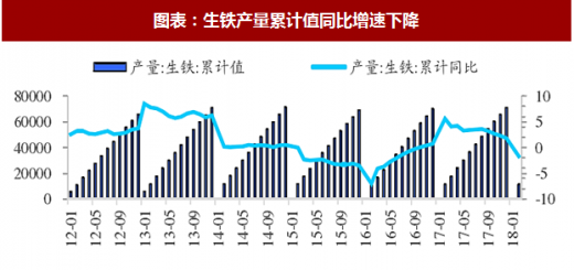 生铁产量累计同比增速下降。2018 年 1-2 月份生铁产量累计值为 11331.2 万吨,同比下降 1.70%,增速较 2017 年全年增速下降 3.5 个百分点。由于采暖季限产对高炉生产的限制,铁水的生产出现减少,预期随着采暖季限产的结束,生铁产量将逐渐走高。