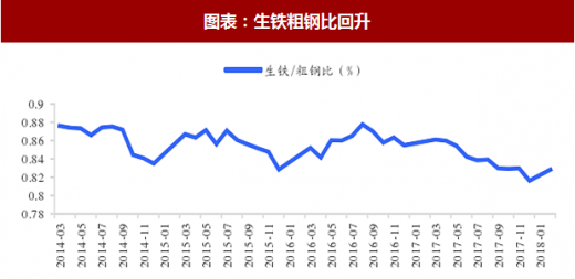 2018 年 1-2 月铁水粗钢比小幅回升到 82.82%。即粗钢产量中 17.13%是废钢,这一比例缩小主要是来自 16 年下半年至 17 年上半年高炉转炉流程中废钢添加的上升。这一比例近三个月并未明显缩小,说明高炉添加废钢及电炉的大规模复产在近三个月增量有限,除非高炉和电炉同比例复产。短期随着高炉限产解禁,铁水成本占优,铁水粗钢比有望进一步提升。
