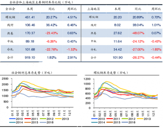 截至2016年12月23日,钢材社会库存为919.10万吨,周环比上升2.91%,同比上升1.82%。其中线材库存周环比上升6.46%,螺纹钢库存周环比上升4.51%,热卷库存周环比上升0.63%,中板库存周环比上升0.43%,冷轧库存周环比下降1.32%。