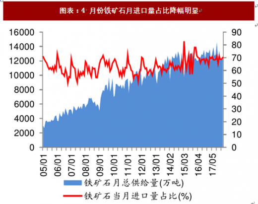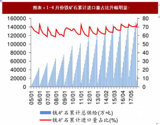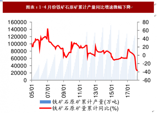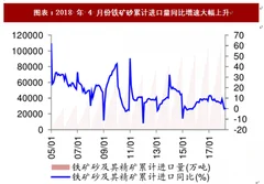 根据国家统计局数据,2018年1-4月份,我国铁矿石原矿累计产量为2.55亿吨,同比下降36.39%,增速环比下降0.07个百分点;2018年4月,我国铁矿石原矿当月产量0.67亿吨,同比下降34.73个百分点。根据海关总署数据,2018年4月份,铁矿砂及其精矿累计进口量为3.53亿吨,同比上升0.09%,增速环比上升0.23个百分点;2018年4月份,铁矿砂及其精矿当月进口量为0.83亿吨,同比上升0.84%,增速环比上升11.06个百分点。高压常态化抑制钢厂产能释放、港口库存高企,整体矿石处于供过于求的状态。参考观研天下发布《》