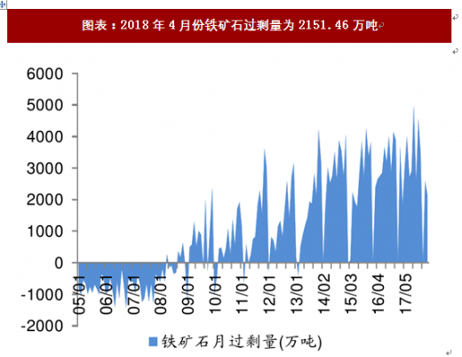 我们测算2018年4月铁矿石过剩量为2151.46万吨,环比下降423.19万吨,同比上升313.69万吨,过剩压力有所缓解。主要是因为随着限产任务的完成,采暖季限产高炉陆续恢复生产状态加大了对铁矿石的需求、海外矿山发货量趋降。