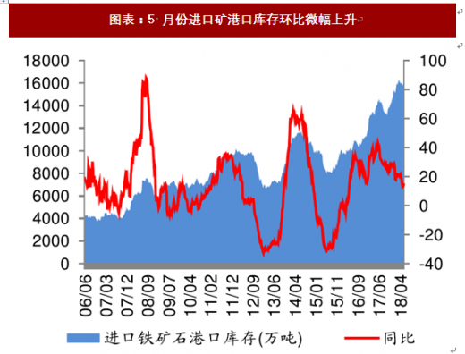 铁矿石原矿产量增速的提高,使得进口铁矿石和国产铁矿石的价差减小,进口铁矿石的价格优势逐渐消失,我国从2011年开始出现国产矿替代进口矿的趋势。将我国铁矿石原矿产量按照一定比例折算成铁精粉以后测算,2018年1-4月铁矿石累计进口量占铁矿石供应量的比例为75.15%,环比上升1.61个百分点;2018年4月铁矿石当月进口量占石供应量的比例为67.70%,环比下降2.35个百分点。6月1日,进口铁矿石港口库存16040.16万吨,同比上升14.46%,周环比上升0.95%,月环比上升0.15%。