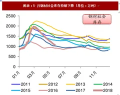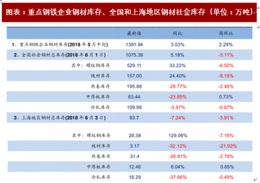参考观研天下发布《》社会库存降至1075.39万吨,周环比降幅明显。我的钢铁网统计数据显示,截至2018年6月1日全国主要市场五大钢材品种社会库1075.39万吨,周环比下降 5.11%,同比上升5.18%。5月份,主要钢材品种吨钢毛利高企刺激在产产能提高产能利用率,将维持高位。进入6月份,雨季深入,需求环比大概率走弱,供需将呈现两弱格局,社会库存去化速度或将呈现季节性放缓。