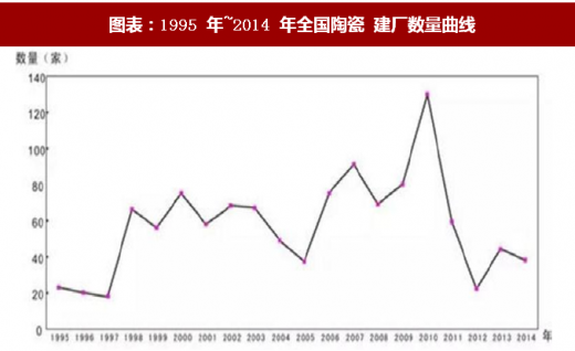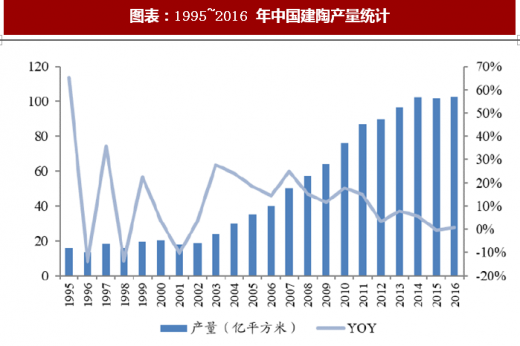 从 1995 年到 2016 年,我国陶瓷砖产量增长超 6 倍,从 1995 年的 15.8 亿平方米增长至 2016 年的 102 亿平方米。其中,仅 1996 年、1998 年、2001 年、2015 年产量同比出现下滑,分别下降 14.33%、13.44%、10.31%、 0.49%,其余年份均保持高速增长。尤是 2003 年~2011 年间,瓷砖产量均保持了 2 位数增长。2012 年后需求增速逐渐减缓,至 2014 年,我国产量首破百亿,达到 102 亿平方米,期间陶瓷建厂数量伴随需求有类似变化。