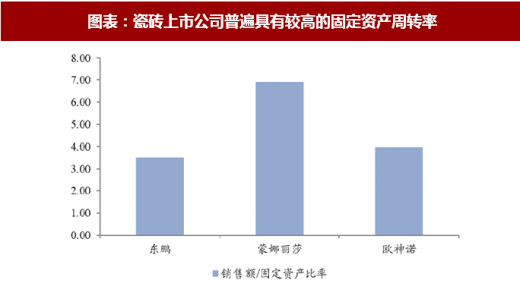 瓷砖固定资产周转率高。我们以三家瓷砖上市公司东鹏、蒙娜丽莎和欧神诺为例,测算瓷砖龙头企业的每固定资产销售额 4.8 元左右,而水泥玻璃玻纤等建材重资产行业在 1 元左右,证明瓷砖是一种高资产周转率建材(初始门槛高但周转率快),作为建筑装修的主材之一,也具备显著的消费属性;