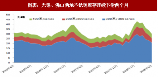 库存方面,截止 5 月底,我国两个最主要的不锈钢流通市场无锡及佛山的库存量为 30.08 万吨,同比增加 3400 吨,其中 300 系为 20.75 万吨,同比增加 2200 吨;200 系 4.58 万吨,同比增加 3400 吨;400 系为 4.75 万吨,同比减少 2200 吨,不锈钢库存继上个月继续呈现回落的趋势。