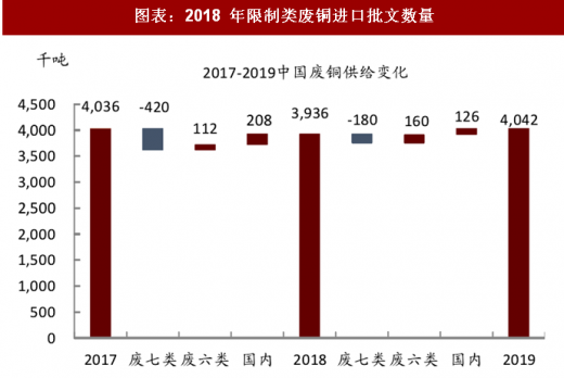 废六类进口增加将对废七类进行弥补,18 年国内的废铜总供给量小幅回落 2%。废铜供给方面,主导因素为中国废七类铜的进口限制和环保督察常态化。目前我国再生铜占精铜产量的 20%左右,截至目前 18 年共公布 13 批次限制类铜进口的批文数量为 48.51 万吨,较去年的 200 万吨减少近 76%。虽然废七类铜(hs code 7404000010)进口受限,但是受益于国内炼厂将大量废七类铜通过在东南亚处理后转为废六类铜,废六类铜(hs code 7404000090)进口量将会增加,从而将对进口量下降带来一定的弥补。而受益与供给侧改革,国内废铜更多进入市场。因此,综合来看 18 年国内的废铜总供给量小幅回落2%左右至 394 万吨。