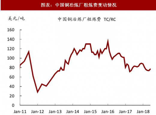 由于海外铜矿企业薪资谈判主要集中在下半年,我们预计供应扰动将会上升,边际上可能会有所收紧。18 年初以来市场对供给的担忧主要有两个方面,一方面是全球最大的铜矿生产国智利和秘鲁将迎来最为频繁的工资谈判年;另一方面是中国对于废铜进口的限制。目前来看今年以来铜矿整体供应情况仍较宽裕,一季度全球主要矿山产量同比增长 14%(图表)。主要由于去年必和必拓(rio tinto)受到罢工因素的影响,17q1 产量下降到 22.7 万吨,而 18q1 产量同比恢复 101%至 45.7 万吨。从 tc 走势来看,上半年在铜矿供给干扰较低的情况下,tc 继续维持低位,而近期的回暖主要是受到印度印度冶炼厂关停事件影响。