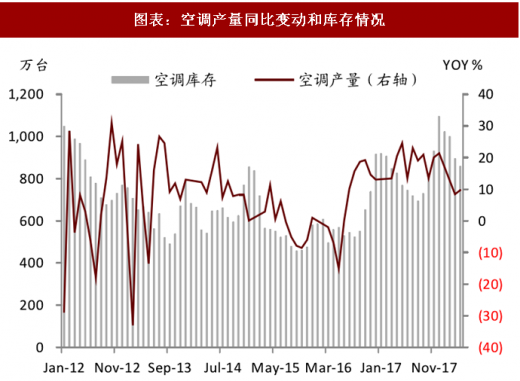 家电方面, 17 年空调高景气的产销带来高基数,所以 18 年空调产量增速同比有所放缓。伴随房地产新开工和销售数据的稳健,考虑到其对铜消费拉动的滞后性,我们预计下半年空调产销数据预计向好。但是,目前空调库存水平偏高,居 5 年历史同期高位。