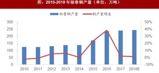 2017年铜精矿产量较2016年有所下降。根据数据,2017年全球铜精矿(含铜金属量)产量达1984万吨,同比减少1.45%。2017年铜矿产量减少与全球矿产资源品位下降、智利工人罢工等因素有关。因智利国家铜业旗下的矿山品位下降及必和必拓旗下escondida长达44天罢工带来产量减产,2017年,智利铜产量达到约550万吨,较2016年同期减少0.9%,若escondida铜矿恢复以前产能,2018和2019年智利铜产量持续增加至574万吨和591万吨。