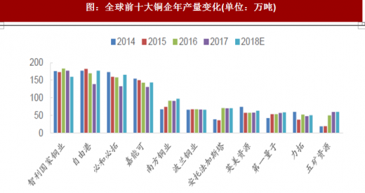 全球前十大铜企产量稳定,增速趋缓。根据司年报披露,2017年全球前十大铜企产量1059.59万吨,同比减少3.45%,预计2018年全球前十大铜企产量为1112.50万吨,铜资源集中度进一步提升。2016年智利铜业旗下的铜资源品位从2009年0.83%降至2016年的0.71%,嘉能可旗下铜矿产量受秘鲁的洪水等异常天气影响,必和必拓旗下埃斯康迪达铜矿工人罢工等导致公司产量下降。