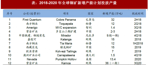 根据数据,全球铜矿产能前十国家产能总计占全球80%左右,但2017年之后因新增矿山产能减少、全球大矿山枯竭关停等因素影响,产能开始下滑,预计2019年产能达到2073.4万吨,占全球总产能的78.3%。未来几年铜精矿的增量主要来自于新项目的投产。2018年-2020年新增投产项目有13个,其中年产能20万吨以上的铜矿项目仅2个。2018年产能释放或达到84吨,但是大部分项目投产在2018年下半年,甚至延期到2019年。我们预计2018年实际新增铜精矿约为38万吨,2019和2020年新增产量分别约为44万吨和56万吨。