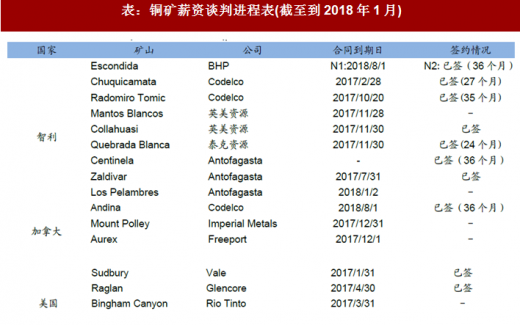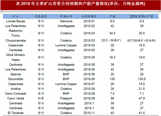 新的劳工法的颁布、工会地位的提升。铜价的上涨,工人日益增长的工资预期与矿山利益之间的矛盾日益凸显。2018年全球最大的铜生产国智利将迎来大规模的薪资谈判,超过30家与工会进行谈判,铜供应存在巨大变数。根据据估算,劳资谈判将影响到该国约350万吨金属吨的产能,约占该国当年四分之三的铜产量,约占当年全球产量的20%,进而将对2018年全球铜的供给带来干扰。