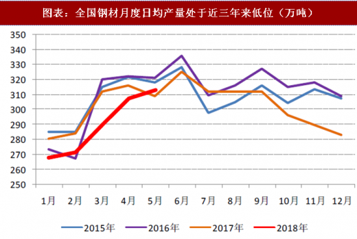 国家统计局发布的 2018 年 5 月数据显示:粗钢日均产量同比增长 8.90%、环比增长 2.36%至 262 万吨,再创历史新高;钢材日均产量同比增长 1.34、环比增长 1.81%至 313 万吨。较历史最高点(2016 年 6 月的 336 万吨)仍然低出 6.73%。对于粗钢产量历史新高,但钢材产量仍处于近三年以来的低位,可能有两个方面的原因:(1)在 2017 年 6 月份之前仍然有大量的地条钢存在,这部分未被统计到粗钢产量中,但是大部分统计进了钢材产量中;(2)钢厂销售中直供模式的增加,使得中间材、重复统计变少。