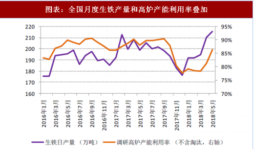 在国内,钢铁供应量 90%是通过长流程(高炉-转炉)而来,但是在取暖季之后,高炉里面也普遍加废钢,因此生铁的产量除了受高炉产能利用率影响以外,还受加废钢量的影响(会受到钢铁业的盈利以及生铁和废钢的价差影响)。全国日均产量 5 月份环比增加 2.57%至 216 万吨,但是 mysteel 调研的全国高炉产能利用率环比却增加 6.40%至 86.40%,也就是说,国家统计局的生铁产量数据是小于通过微观调研(mysteel 的高炉产能利用率)而预测出来的数据约 4 个百分点,这对钢产量而言,并不算小。