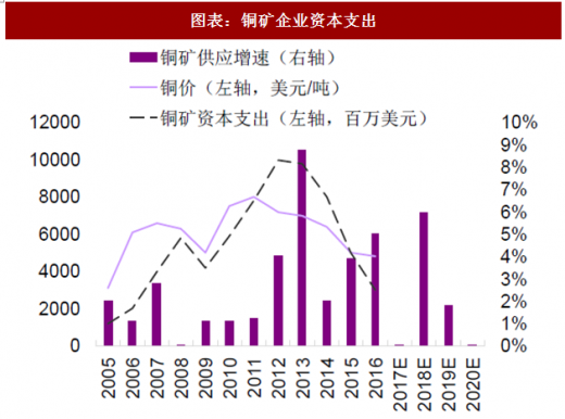 我们认为铜矿投产高峰已过,供给增速下滑。产量增速已从 2016 年的最高点 6.49%逐步下滑,铜矿资本支出(capex)由 13 年 120 亿美元降至 2016 年的 40 亿美元。本轮铜矿资本支出于 2012 年左右见顶,周期性规律铜矿产能高峰预计于 2020 年前后见顶。