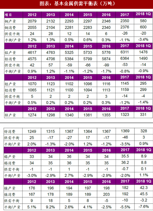 根据 2012 年至 2018 1q 金属供需平衡表分析,有色金属行业整体呈现紧平衡格局。在这种背景下,供求双方变量的边际变化均会对价格产生强烈影响。