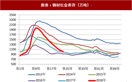 截至 2018 年 6 月 14 日,mysteel 统计的全社会钢材库存为 998.55 万吨,环比下降 38.69 万吨,降幅 3.7%,较 5 月份的去化速度稍有放缓,目前库存水平已处于历史较低水平,对钢价有所支撑。