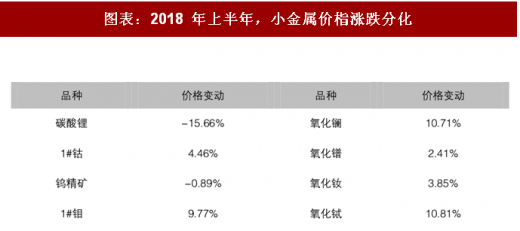 小金属价栺亦呈分化走势,碳酸锂价栺回调。2017 年表现强势的价栺出现了回调,2018 年上半年下降 15.66%;2018 年上半年钴价栺一季度表现强劲,事季度回调,累计上涨 4.46%;部分稀土氧化物有所上涨。