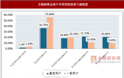 资产增值和保是互联网黄金投用户的最主要目,其中重度更注通过理财提升自己生活品质而一般用户更偏向于通过理财防范风险。在可承受的投资亏损程度方面,重用能力强接本金失10%及以上的用户占比达到42.5%,相比之下,一般用户能接受本金损失10%及以上的用户仅占20.5%。