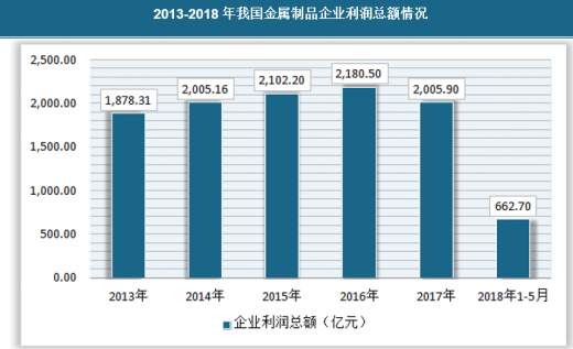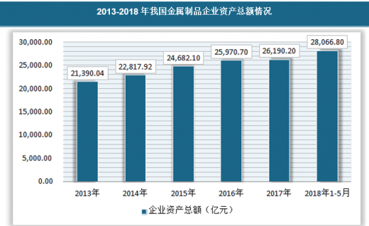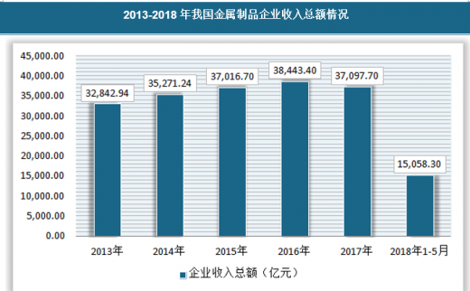 近年来,我国金属制品行业有了较快的发展,企业数量在逐年增长,截止到2018年5月,行业有23458家企业,较上年增长了11.8%。行业企业的资产总额也在逐年增长,到2018年5月为28066.80亿元,较上年增长了7.1%左右。从行业企业的营收来看,2017年为37097.70亿元,较上年减少了3.5%左右,利润总额也相对8.0%左右的下降。