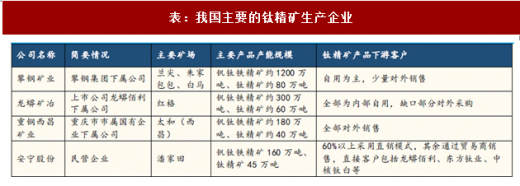 我国具备钛精矿产能的企业多达400余家,主要的钛精矿采选企业包括攀钢矿业、龙蟒矿冶、重钢西昌矿业以及安宁股份等。上述四家企业均集中于我国攀西地区,产品以钒钛铁精矿为主,四家公司的钛精矿年产能合计约225万吨。