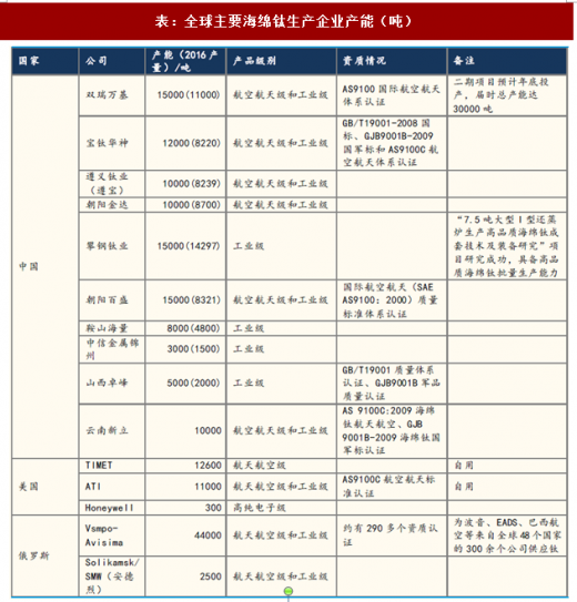 俄罗斯的vsmpo-avisma是最大的海绵钛生产企业,年产能可达4.4万吨,公司约有290多个资质认证,为波音、eads、巴西航空等来自全球48个国家的300余个公司供应钛。