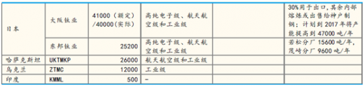 全球三家具有稳定高纯电子级钛产能三家公司中的两家在日本(三家分别是大阪钛业、东邦钛业和美国honeywell),美国目前生产的航空航天级海绵钛多属自用。