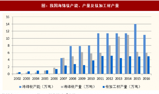 我国海绵钛行业产能过剩问题自2015年开始凸显,2015年,我国海绵钛产能达到历史峰值14万吨,而当年全国海绵钛产量仅6万吨,产能利用率不足50%。