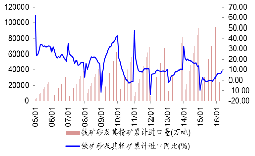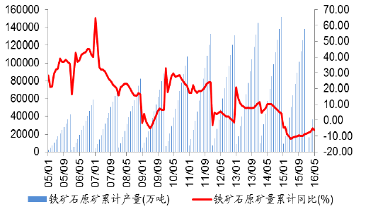 2016年1-5月份,我国铁矿石原矿累计产量为4.72亿吨,同比减少6.06%,增速环比下降1.09个百分点;5月,我国原矿当月产量为1.08亿吨,同比减少8.60个百分点。1-5月份,铁矿砂及其精矿累计进口量为4.12亿吨,同比增加9.01%,增速环比上升3.09个百分点;5月,铁矿砂及其精矿当月进口量为0.87亿吨,同比上升22.42%,增速环比上升17.80个百分点。6月份,南方进入高温雨季时节,、基建等项目建设或减缓,终端钢需走弱,同时供给侧改革进入落地期,叠加行业重回亏损,钢铁供给端将有所收缩,预计铁矿石产量和进口量稳中有降。、2005-2016年中国铁矿石原矿累计产量