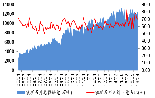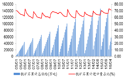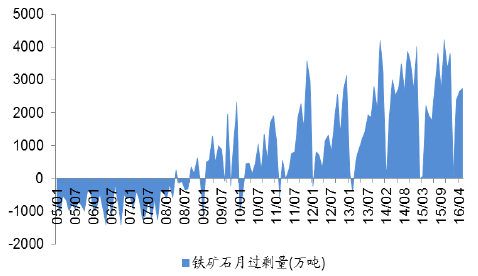 2005-2016年中国铁矿石过剩量