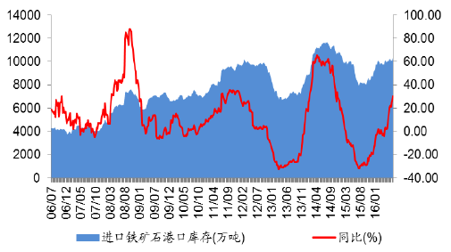 2006-2016年中国进口矿港口库存