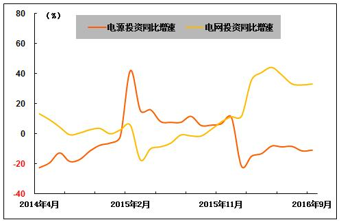 从电力投资结构来看,电源、电网投资分化明显,电源投资同比继续下降,电网投资则继续保持快速增长。中国电力企业联合会发布的数据显示,2016年1-9月份,全国电源工程完成投资1,989亿元,同比下降10.9%,占电力基本建设投资完成额的比重为35.8%。电网基本建设完成投资3,566亿元,同比增长31.6%,占电力基本建设投资完成额的比重为64.2%。