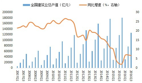 1、建筑2016年前三季度全国建筑业总产值125792亿元,同比增长6.65%,较二季度收窄0.35个百分点,较去年同期扩大4.31个百分点,今年以来持续呈平稳复苏态势。建筑业增加值33193亿元,同比增长6.9%,较二季度扩大0.9个百分点。全国建筑业房屋建筑施工面积107.8亿平方米,同比增长1.6%,较二季度下降0.3个百分点。
