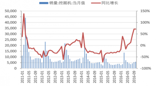 2016 年 10 月,我国挖掘机月度销量为 5816 台,同比增长 71.36%;推土机月度销量为 257 台,同比增长 179.35%;汽车起重机月度销量为 651 台,同比增长 32.86%;装载机月度销量为 7826 台,同比增长 85.76%。