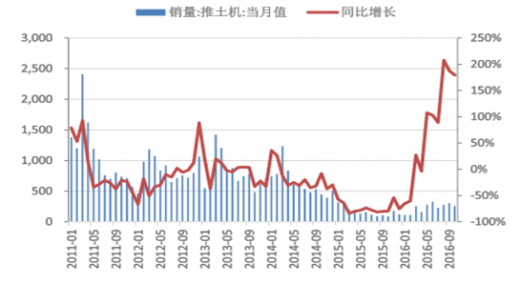 我国推土机月度销量与同比增速(2011-2016 )