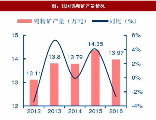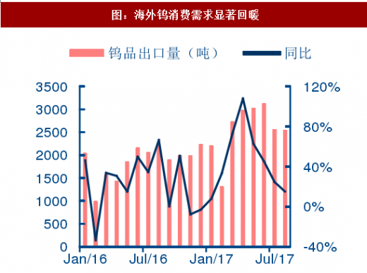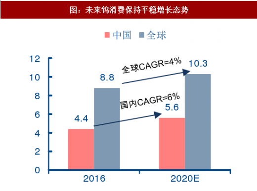 钨终端消费保持平稳增长态势。2016 年中国钨消费量约 4.4 万吨(金属量),预计到 2020 年将达 5.6 万吨,cagr 为 6%;海外钨消费显著回暖,截止 2017 年 8 月,我国累计出口钨品 2.05 万吨,同比增长 43.3%,全球 2016 年钨消费量 8.8 万吨,到 2020 年预计达到 10.3 万吨,cagr 为 4%。