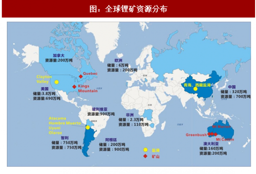 全球锂资源主要储存在盐湖卤水和锂矿石(锂辉石、锂云母)。盐湖主要分布于南美三国——阿根廷、智利和玻利维亚,以及中国青藏地区。锂矿石资源主要分布于澳大利亚、北美以及中国。