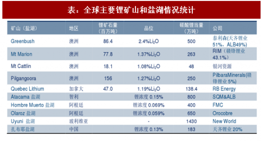 世界级锂资源集中在南美和澳洲。大型盐湖包括玻利维亚乌尤尼盐沼uyuni,智利盐湖atacama,阿根廷盐湖olaroz、hombremuerto等。主要锂辉石矿包括澳大利亚talison旗下的greenbush矿山和rim公司的mtmarion锂矿。