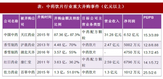 行业特征:集中度低,并购整合频繁。中药饮片行业集中度较低,呈高度分散特征,行业龙头康美药业市占率仅2%,新版gmp认证落地为中药饮片行业带来整合机会,企业产业链横向和纵向并购活跃,多家上市公司在中药饮片行业跑马圈地。如国药旗下中国中药(00570.hk)斥资87.36亿元收购天江药业87.3%股权;香雪制药(300147.sz)耗资4.48亿元收购中药饮片企业前十强的沪谯药业70%股权等。据不完全统计,2013-2014年,中药上市公司共发生55起并购和投资事件,其中中药饮片最受追捧,占投资总数的30.9%。