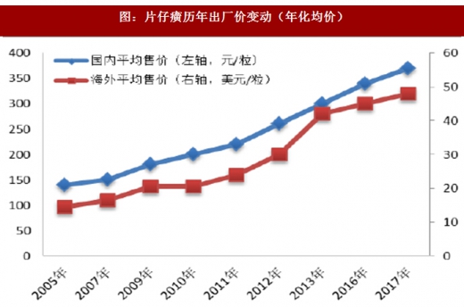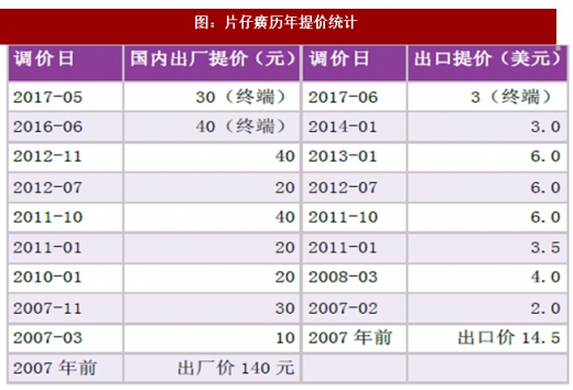 如片仔癀使用天然麝香,目前由于各种麝类动物已经成为濒危物种,我国将其升为一级保护动物,对天然麝香实施管控,并实行配额制。在天然麝香长期供不应求的背景下,片仔癀价格不断上调,在2007-2017年十年间,片仔癀国内出厂价提价9次,国际出口提价8次,国内每粒出厂价由2007年150元上涨至约370元(终端零售价530元),国际出口价从每粒14.5美元提价到48美元左右。东阿阿胶原料是驴皮,我国自古有冬令进补阿胶滋阴补血习惯,是具有3000多年传承的国药瑰宝,受制于消费升级和驴皮资源紧张,自2010年以来,东阿阿胶至今共发布过11次针对产品提价的公告;价格从2006年每公斤160元左右,上升到近4000元左右,期间涨幅超过25倍。