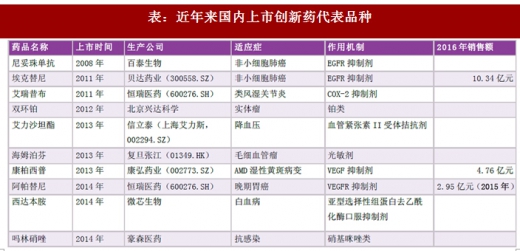 虽然我国创新药研发相比欧美仍差距巨大,但是近年来也有一系列原创度较高的代表性创新药品种最终获批上市,并取得了良好经济效益,如贝达药业(300558)的埃克替尼(2011年上市,2016年销售额约10亿元),康弘药业(002773)的康柏西普(2014年上市,2016年销售额约5亿元)、恒瑞医药(600276)治疗晚期胃癌的阿帕替尼(2015年约3亿元)、微芯生物的白血病治疗药物西达本胺等。