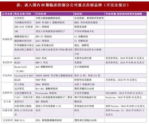 产品研发管线上,由于新药研发周期普遍较长(8-10年),我们更关注进入iii期临床试验,未来2-3年内能看到上市机会,为公司带来利润增厚的品种。部分上市公司进入iii期临床及以后阶段的重点品种如下: