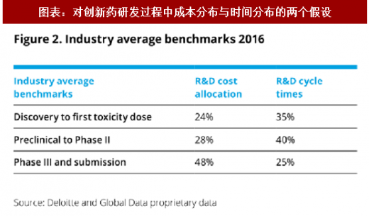 构建该模型需要两个重要的假设,1.创新药研发费用的分布情况;2.创新药研发的时间周期。某公司当年的研发费用是已知的,当年处于三期临床的药品也是已知的,处于三期临床的药品的研发费用是未知的,但是可以根据历史数据推导出来,创新药研发在不同阶段的时间分布可以通过历史数据进行合理的假设。通过授权、并购获得的品种,可以通过相关公告查询到其研发成本与里程碑付款比例。对研发费用分布与时间分布的假设如下,