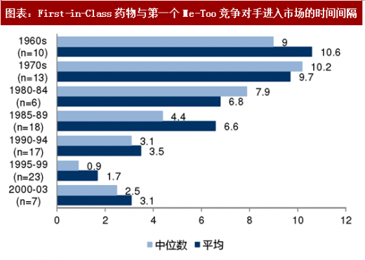 此外,政策的变化也是另一个导致创新药研发回报率降低的原因。hatch-waxman 等法案某种程度上削弱了创新药的专利保护期,fda 也在放松“me-too”类创新药的批准标准,dimasi 教授在这方面做了大量的工作,他指出 1960 年代创新药上市到第一个同靶点竞争对手上市中间相隔 10.6 年,而 2000 年初这个数值已经降为 3.1 年。最近 5 年的数据没有更新,考虑到 opdivo 与 keytruda 等近些年的重磅药品为最先上市争分夺秒,该数值有可能进一步缩短。政策的导向不利于美国创新药的发展。
