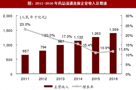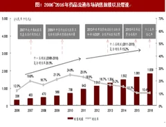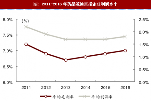 根据统计数据,2016年全国七大类医药商品销售总额18,393亿元,扣除不可比因素同比增长10.4%,预计2017年全年行业增长,%。当前流通企业平均毛利率维持在6.5%~7.0%,平均利润率维持在1.5%~2.0%。