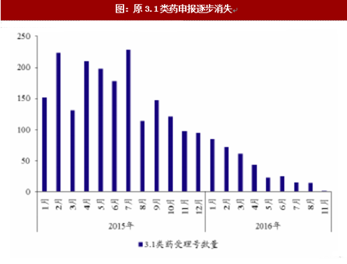 1北药分类改革实施一年以后,原大热的申报方向一一3.1类新药申请已基本消失(自15年8月44号文出台后申报量就明显降低;15年11月化药注册分类改革征求意见稿出台后直线下降;至16年底就已基本消失;