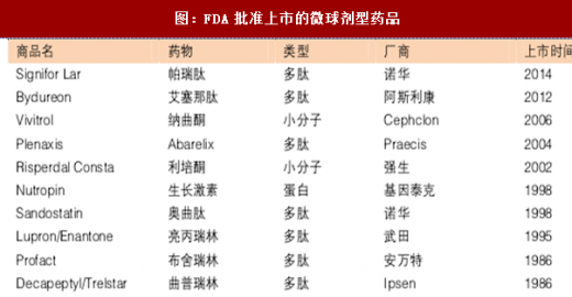 微球是药物溶解或分散于高分子材料(骨架)中所形成的微小球体或类球体,随着骨架的缓慢溶解微球小体内的药物逐步释放収挥作用,溶解速率可控,用药频率可下降至每3个月注射1次。缺点在于针对不同的应用需要个性化的设计和生产,而生产过程中对药物的稳定性有影响,部分药物的损失高达25%-50%。目前fda已批准十余个产品上市,包括多肽和蛋白类激素、小分子精神类用药。微球技术壁垒较高,国内只有丼珠集团等少数几家企业具备。