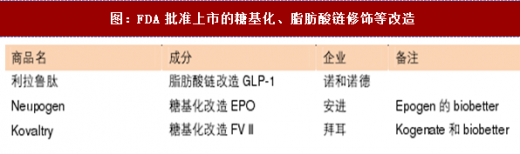 蛋白质表面的糖链、脂肪链等侧链可遮蔽蛋白水解酶位点,阻碍蛋白酶对蛋白药物的降解作用;蛋白质药物表面增加了侧链,提高蛋白质稳定性,分子量增大也可减少肾小球滤过;脂肪酸可与人血清白蛋白可逆结合,复合体在跨膜转运中受限仍而延长在体内的储留时间。该类技术的缺点在于后期的修饰改造、纯化较为复杂。